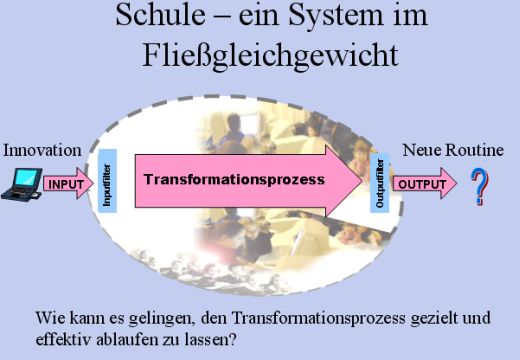 Gesamtwerk nur reibungslos weiter funktionieren, wenn die Prozessabläufe ebenfalls entsprechend verändert werden. Zu diesem Stellglied „Programm“ gehören auch technische Aspekte, die in den Schulen zum Standard werden müssen. Die Administration und Wartung dieser Technologie schafft für die Schulen und die Schulträger zusätzlich neue Arbeits- und Konfliktfelder, die im gesellschaftlichen Konsens gelöst werden müssen.