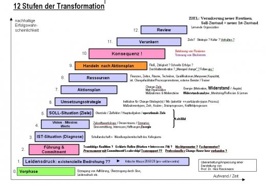4. Stärkere Veränderungen von Routinen verlangen eine Betreuung (coaching) von außen und den Einsatz der Instrumente der Organisationsentwicklung, nämlich Projektmamagement“ und „Changemanagement“!